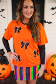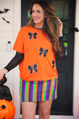 The bright orange color and contrasting collar make a bold statement, while the sequin bow accents add a touch of glam. Embroidery outlining adds an extra touch of detail.