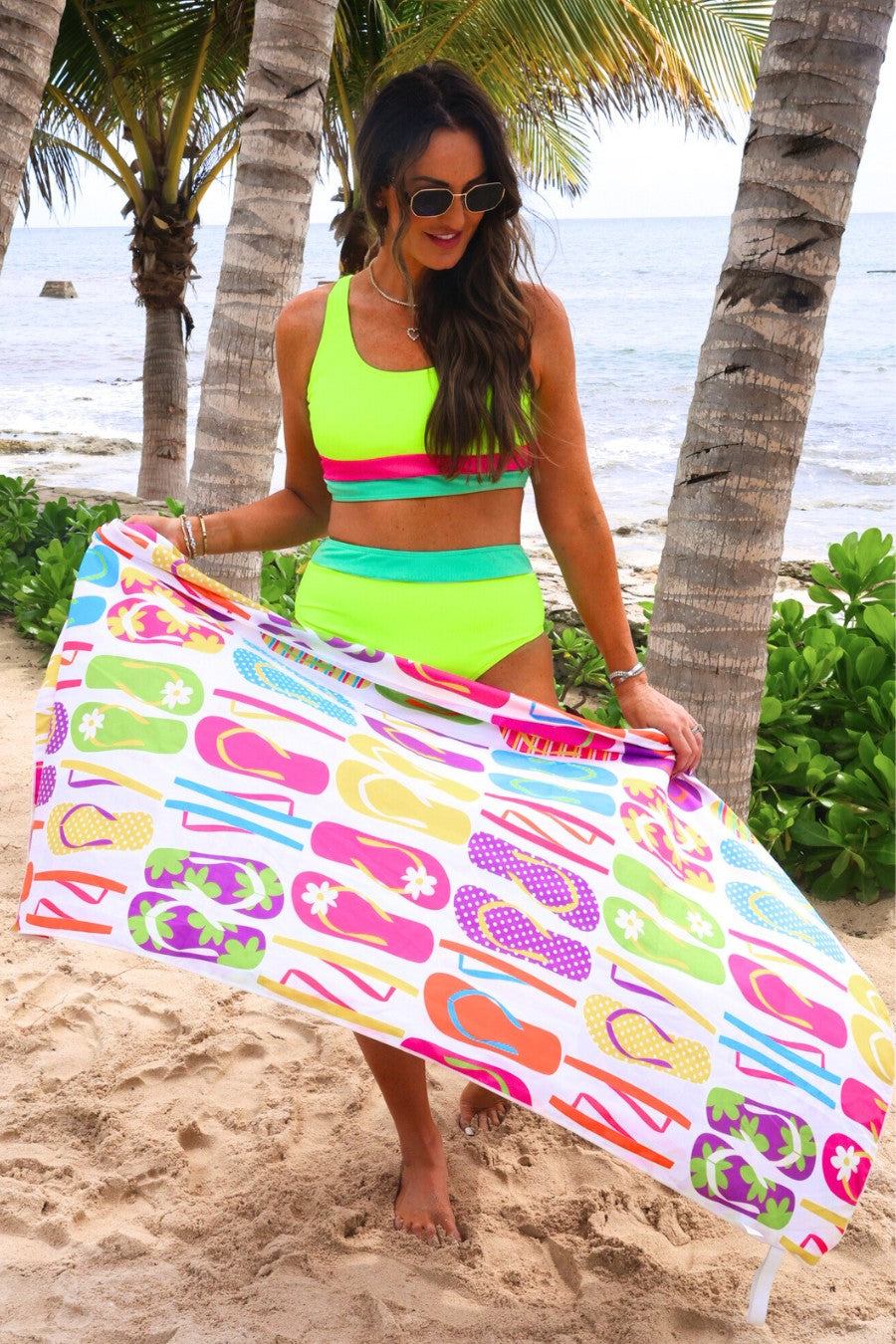 Be the envy of the beach with our Flip Flop Fun Towel in vibrant colors! Easily carry and store with the included bag. Our quick-drying microfiber material and elastic band make this the perfect towel for a day in the sun (or pool!). Also a great giftable!