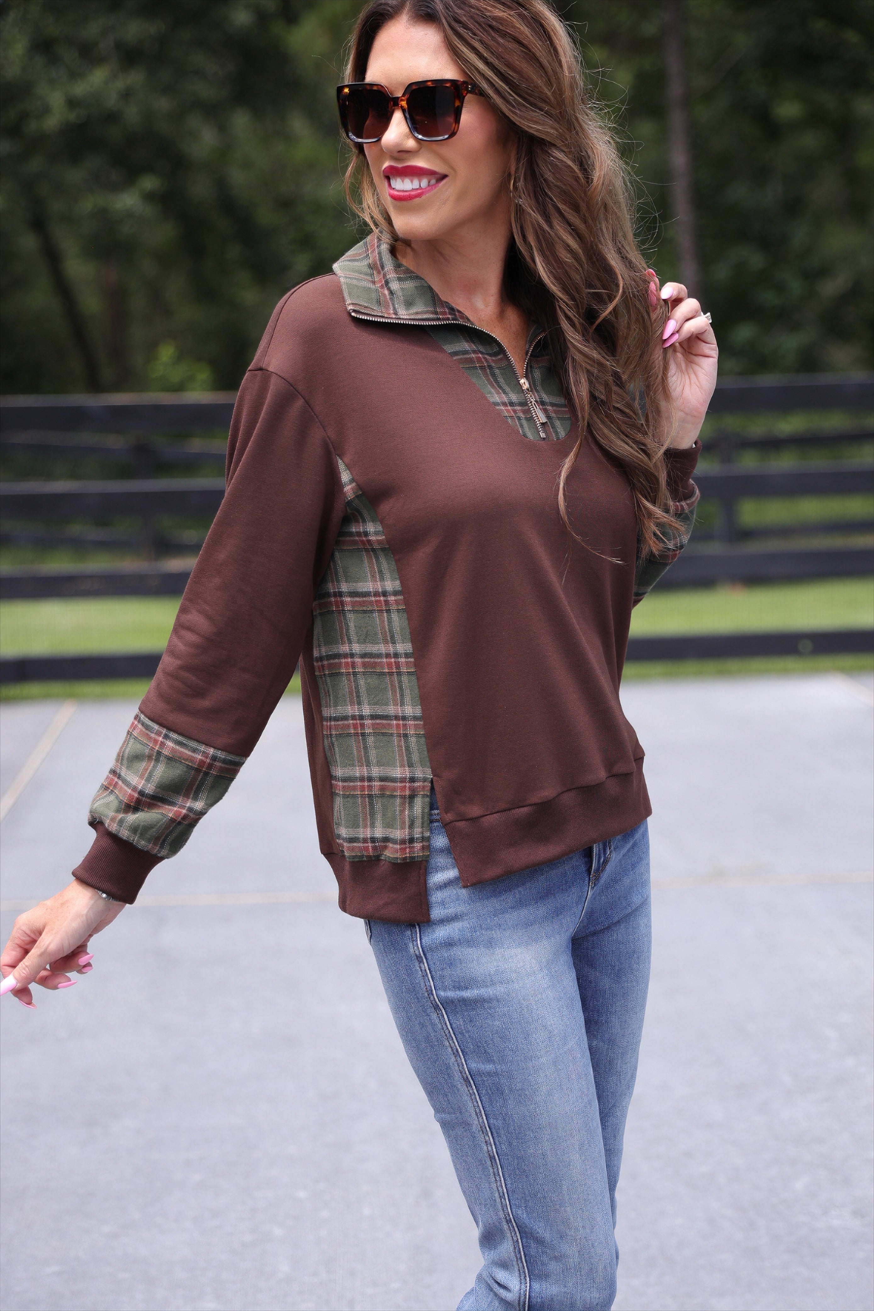Wrap yourself in comfort and style with our Juniper Plaid Pullover. This beautiful chocolate pullover is perfect for the winter season and adds a touch of festive cheer with its classic plaid design. The convenient quarter-zip and elegant gold zipper make it easy to put on and take off, making it a must-have for any holiday occasion. Place your order now and get ready to cozy up in this must-have pullover.