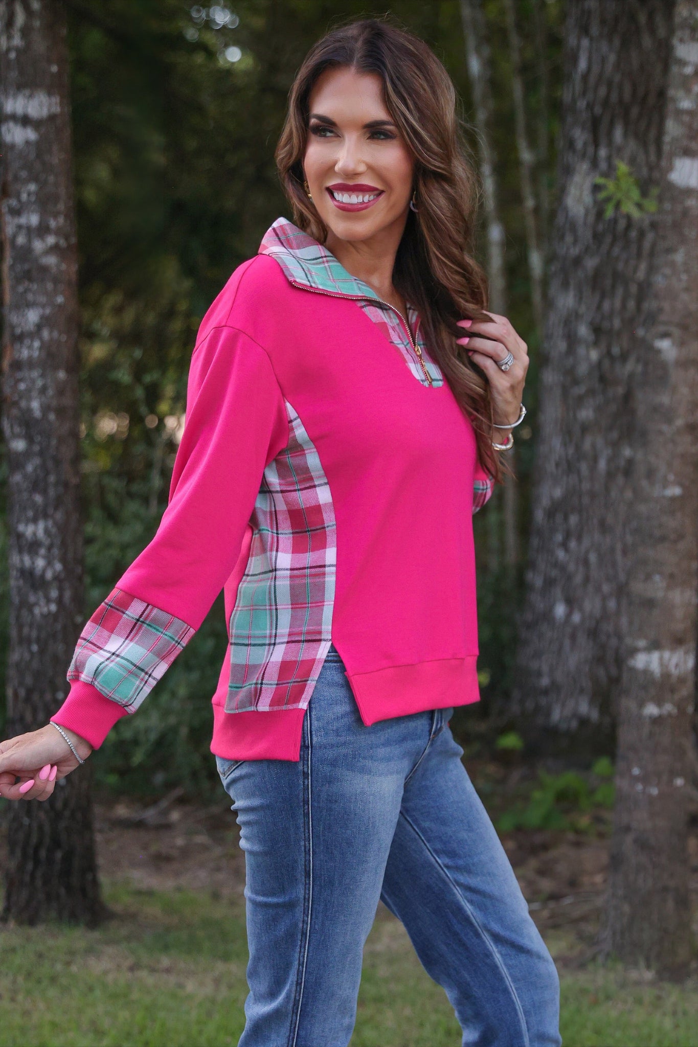 Wrap yourself in comfort and style with our Juniper Plaid Pullover. This beautiful pink pullover is perfect for the winter season and adds a touch of festive cheer with its classic plaid design. The convenient quarter-zip and elegant gold zipper make it easy to put on and take off, making it a must-have for any holiday occasion. Place your order now and get ready to cozy up in this must-have pullover.