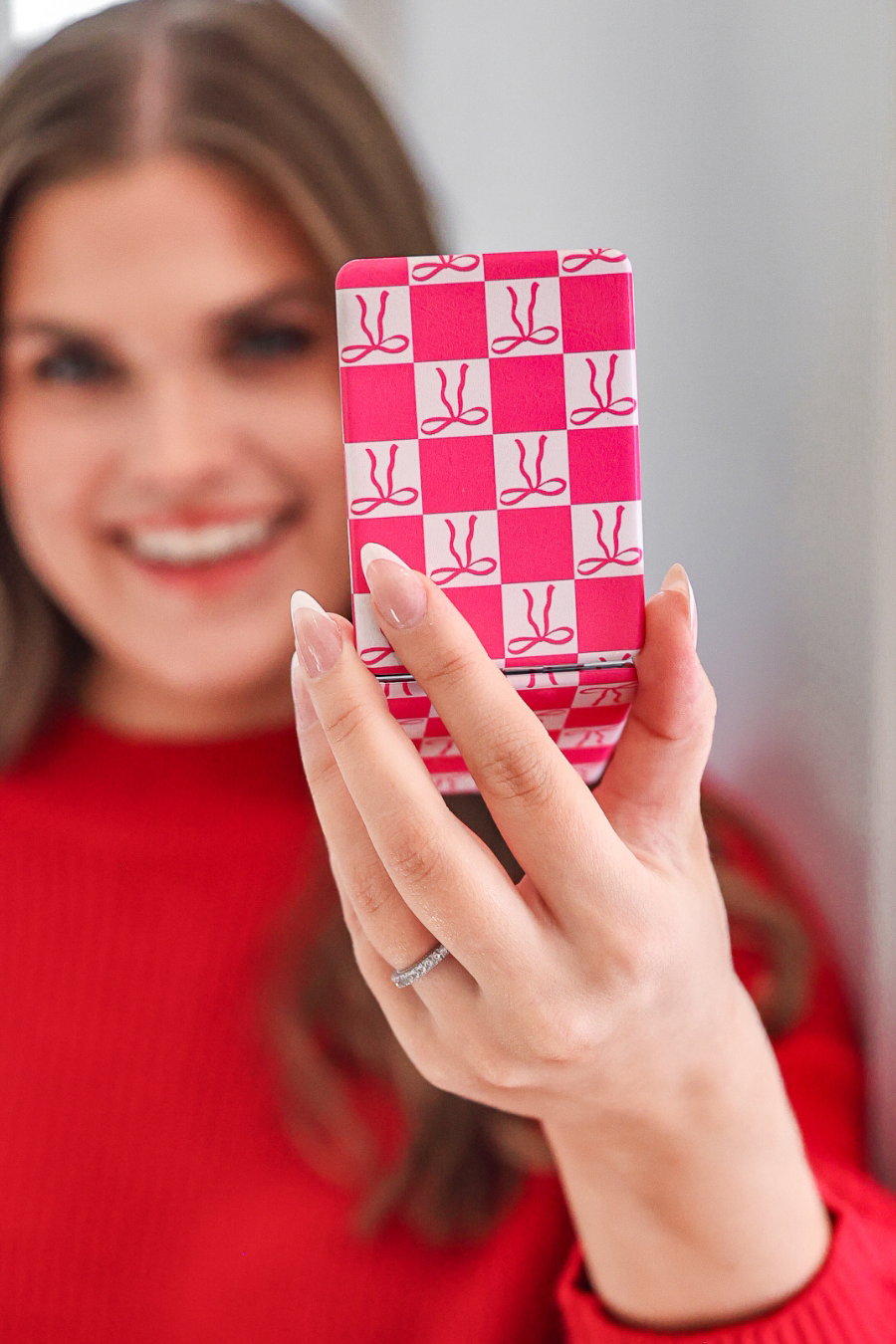 Add a touch of charm to your beauty routine with the Twirls and Bows Compact Mirror. Featuring a playful pink checkered pattern adorned with delicate bows, this compact mirror is perfect for quick touch-ups on the go. Its lightweight design fits easily in your purse or pocket, making it both stylish and practical wherever you go.