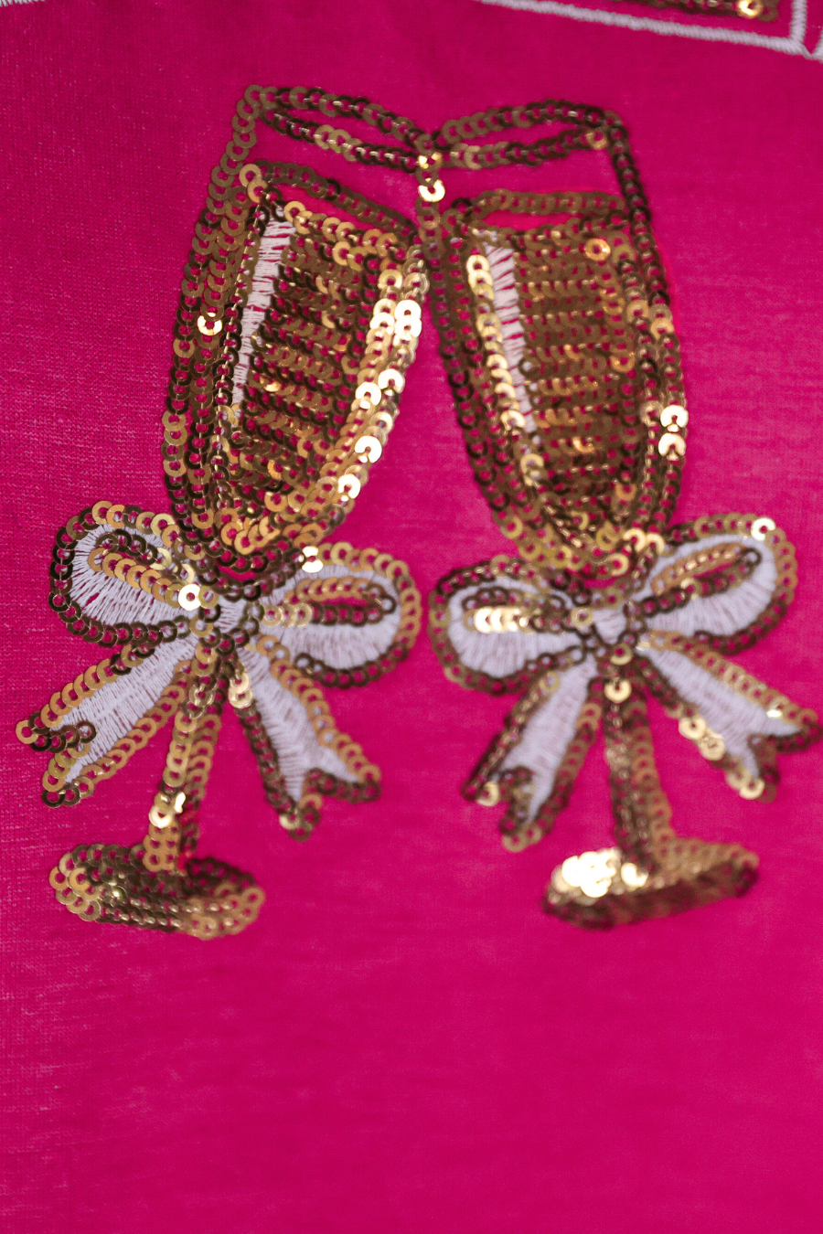 The Champagne Cheers Luxe Pullover in pink is made from our beloved Luxe fabric, offering a soft and cozy feel that's perfect for ringing in the new year. Featuring playful gold sequins and white embroidery, it’s a sparkling addition to your wardrobe to celebrate the season in style!