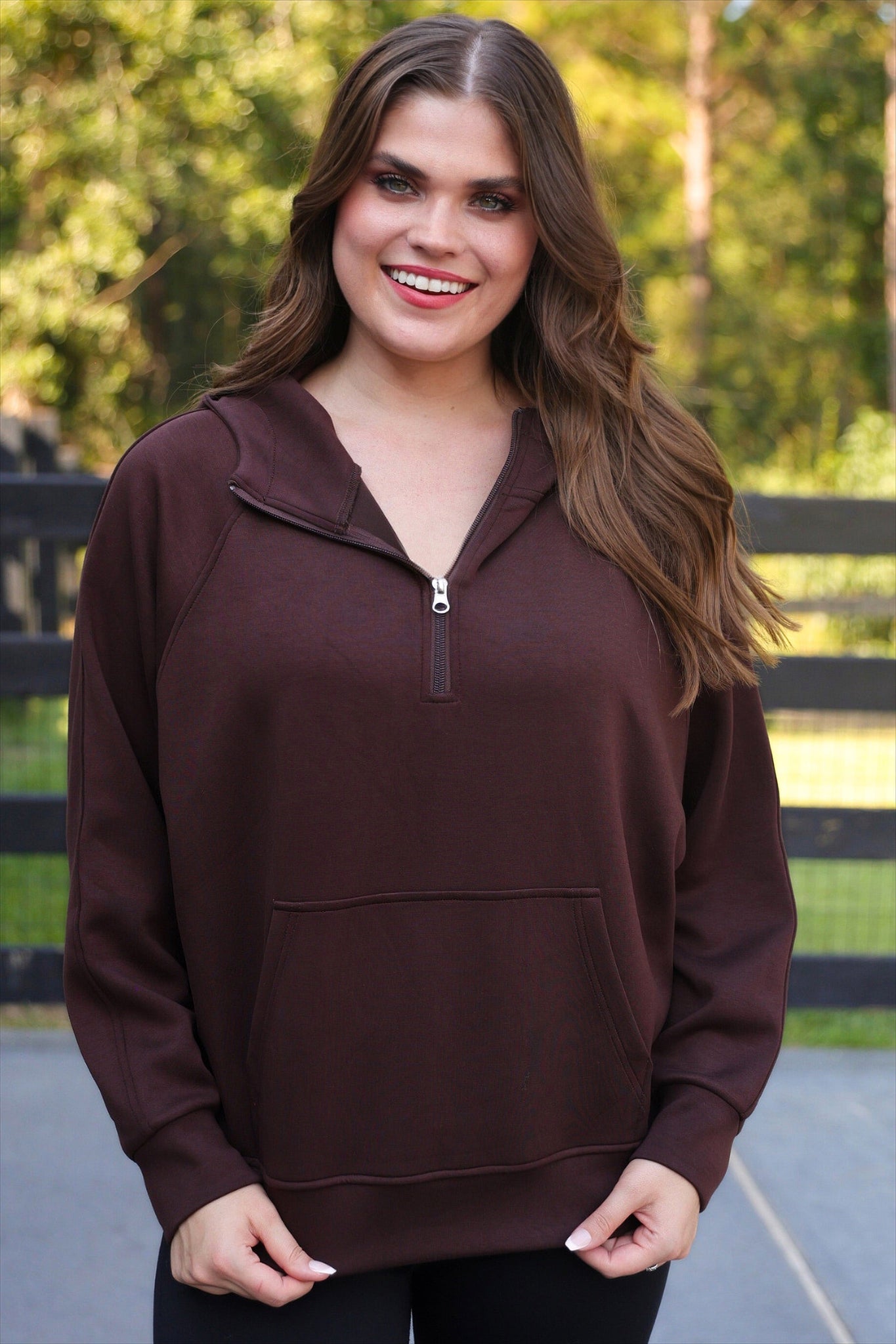 Kayla Luxe Hooded Quarter Zip Pullover- Chocolate