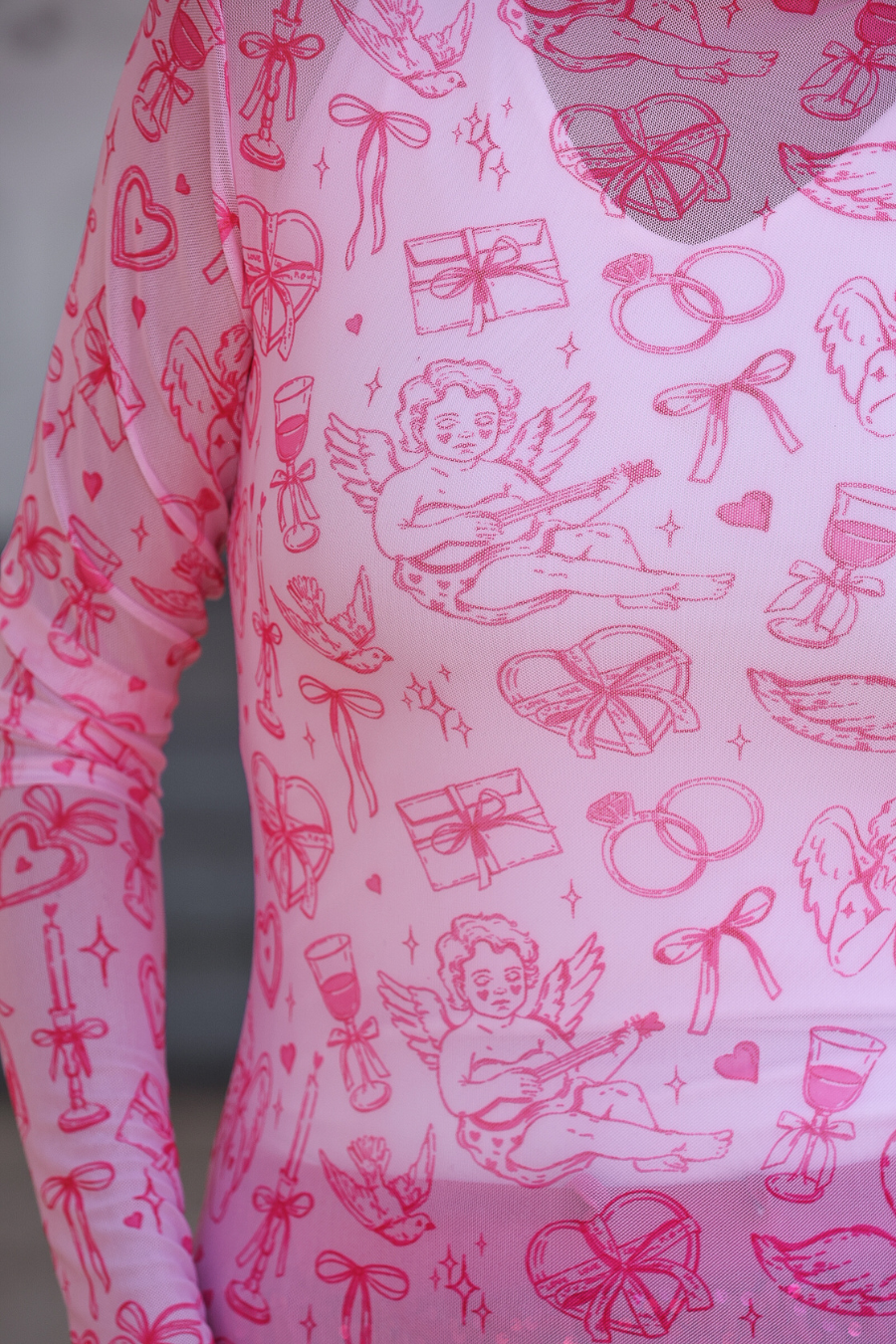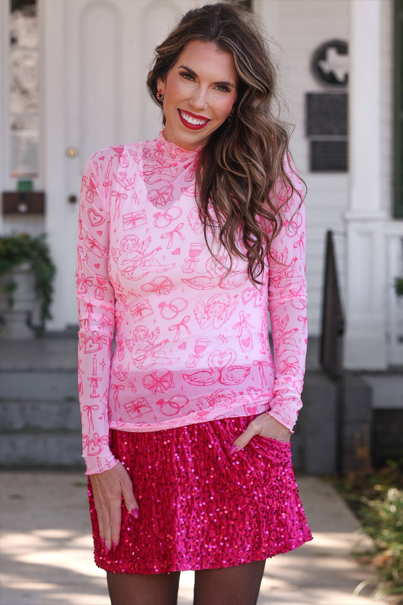 Get trendy with the Keigan Mesh Top in Lover's Daydream! This playful top features lettuce hems, a mock neckline, a romantic Valentines inspired design, and a sheer mesh material that can be layered under or over any outfit. Don't miss out on this must have piece!